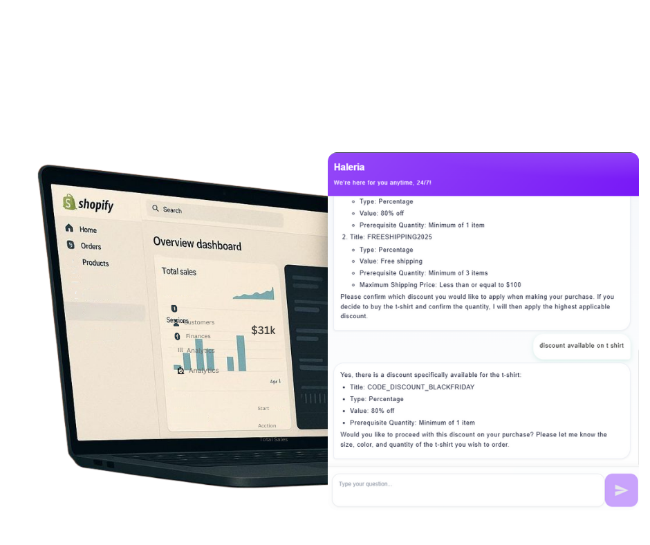 Once activated, Haleria handles customer questions 24/7 on Shopify Chat and WhatsApp