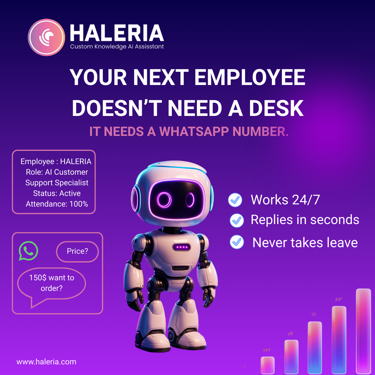 Upload your business details, FAQs, and policies Haleria learns everything and answers customers accurately every time.